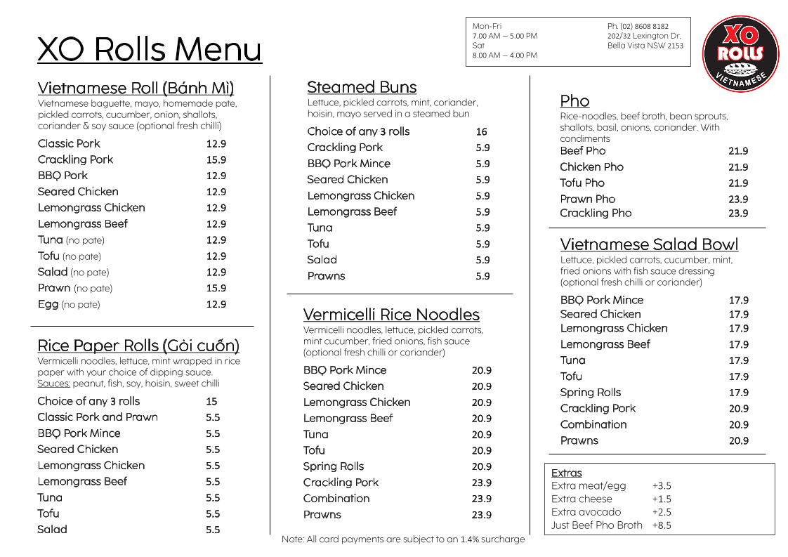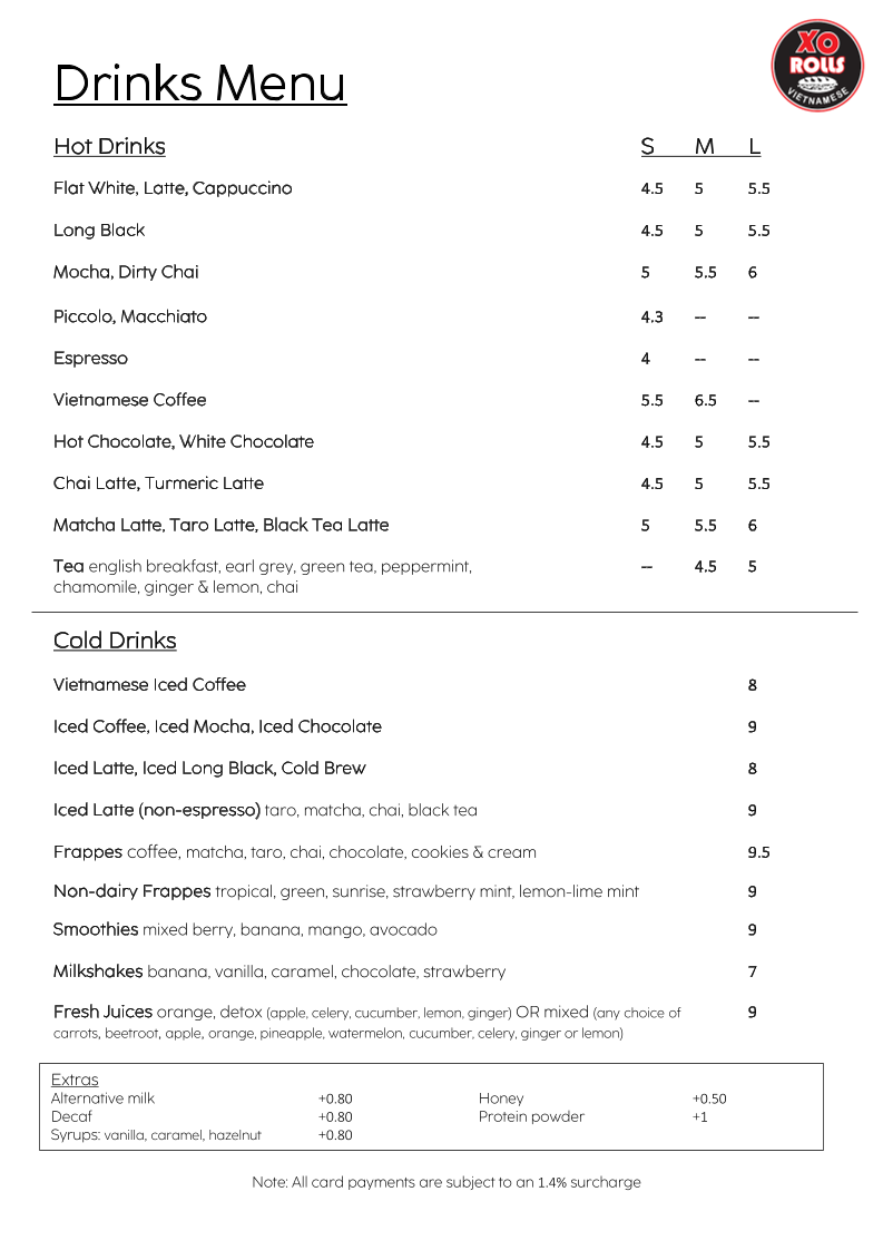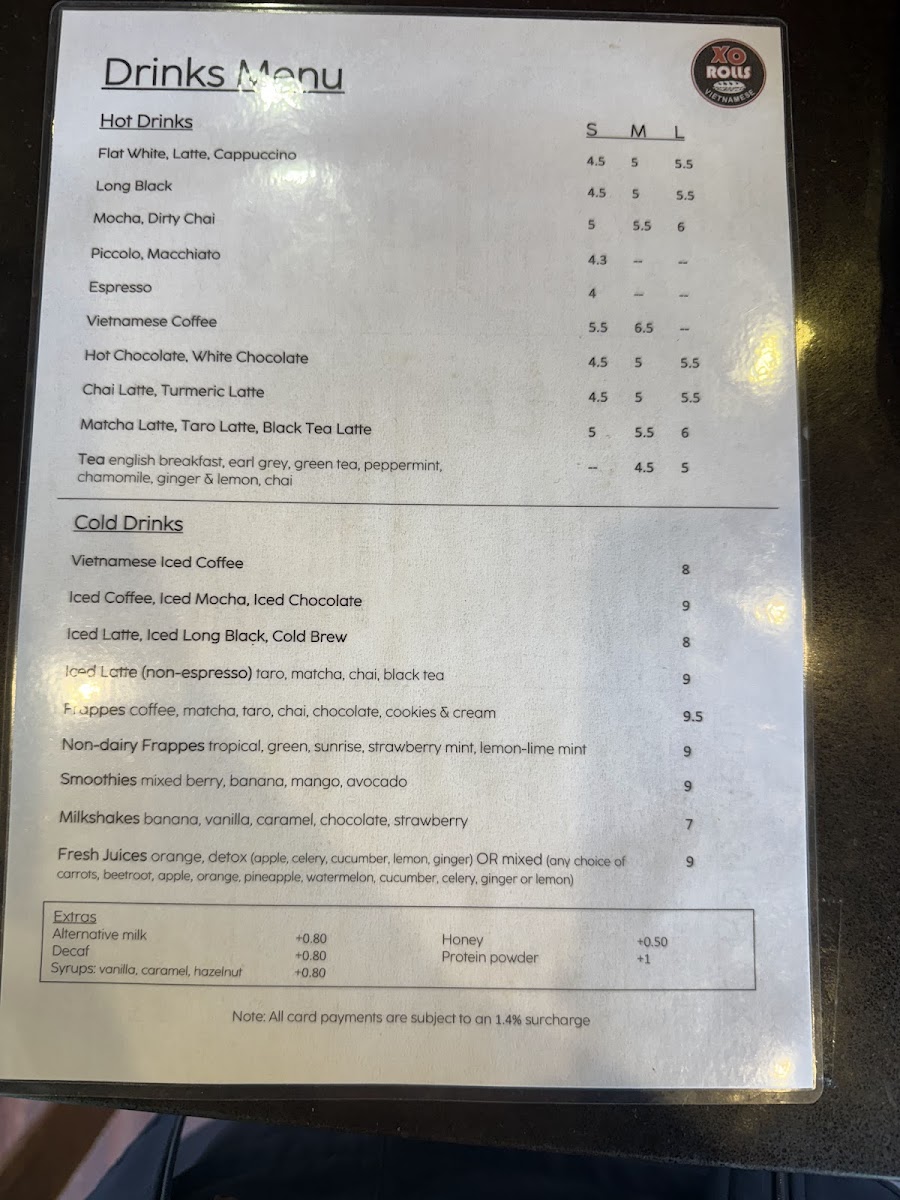 The menu at XO Rolls offers a straightforward yet satisfying selection of Vietnamese-inspired café fare, focusing on fresh, flavorful rolls, bowls, and comforting drinks. It's a casual menu designed for easy meals at any time of day—whether it’s a quick lunch break, a relaxed mid-afternoon bite, or a simple dinner after work.